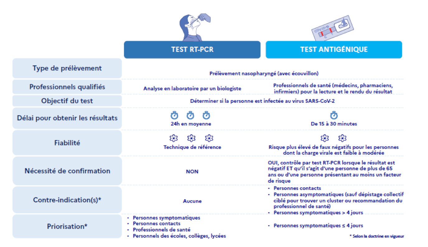 Le test RT-PCR reste la technique de référence. Le test antigénique est moins sensible mais sa rapidité de rendu de résultat est un atout pour casser les chaines de transmission et isoler les cas positifs :